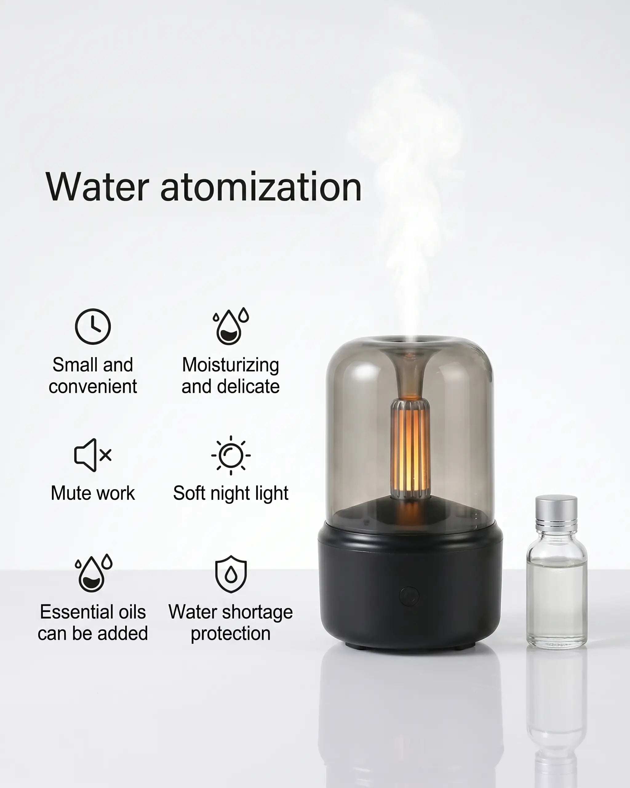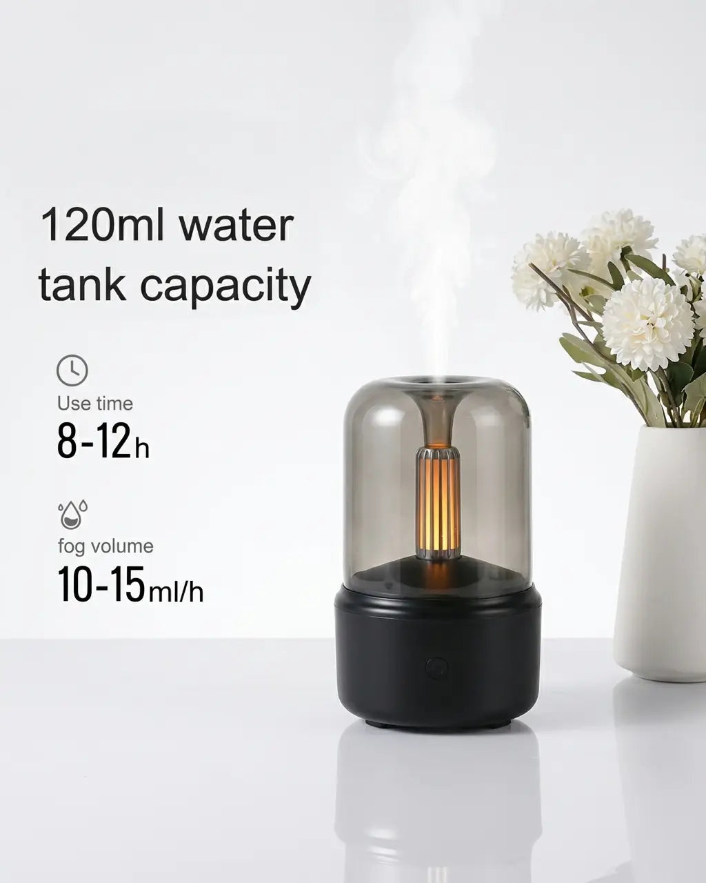 Create your own sanctuary at home with this USB Aroma Diffuser and Air Humidifier — a beautifully designed 3-in-1 device that combines cold mist humidification, essential oil aromatherapy, and a warm candlelight night light effect in one elegant unit. With up to 12 hours of continuous use, whisper-quiet cold mist output, and a smart auto shut-off for safety, this compact desktop diffuser is the effortless way to transform any room into a calming, fragrant retreat. CE, RoHS, and FCC certified for peace of mind.