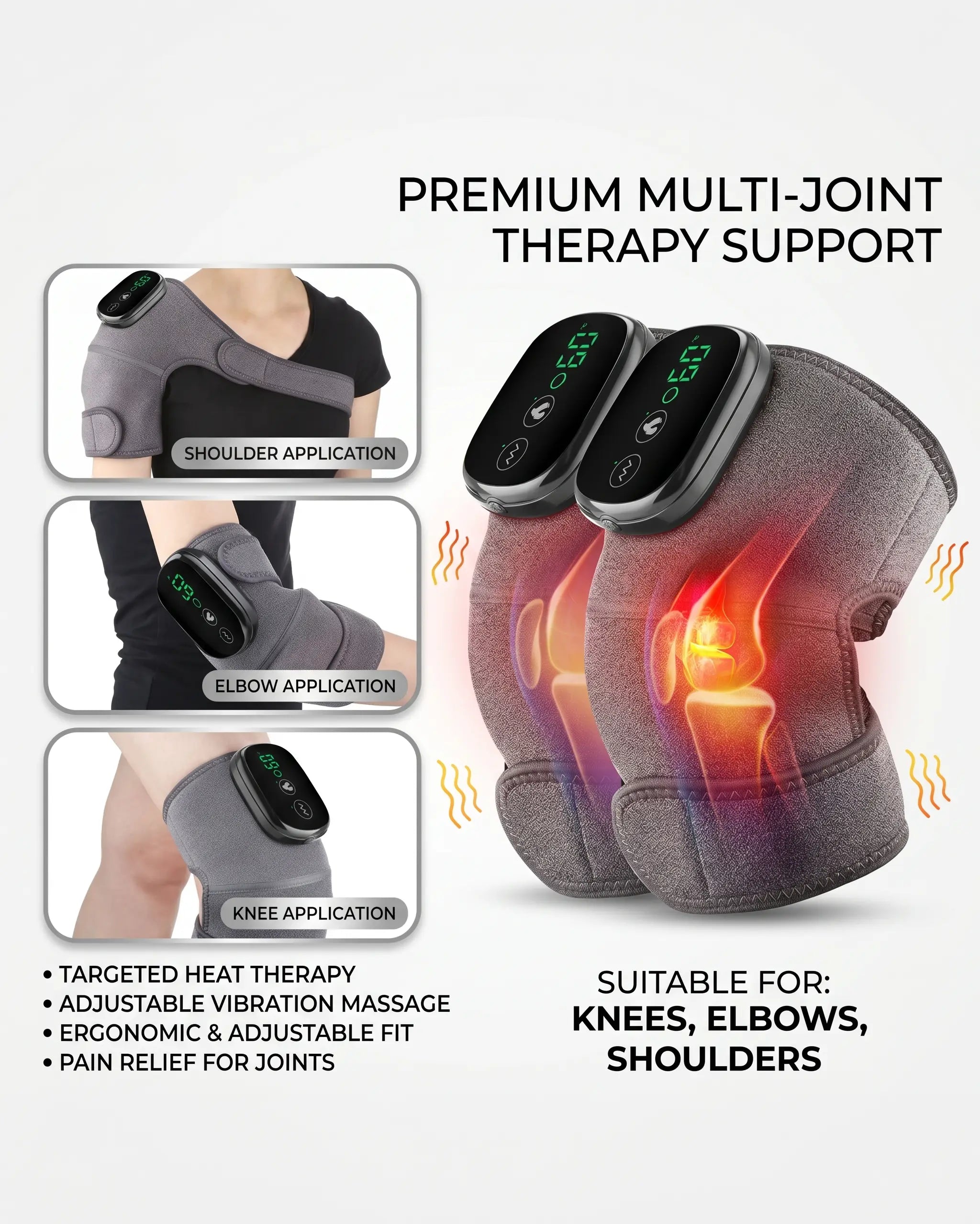 Give your joints the relief they deserve with this Electric Heating Knee Massage Device — a versatile, multi-use therapeutic pad engineered to target knee, shoulder, elbow, and joint discomfort with precision heat and vibration therapy. Featuring three adjustable heating levels, three vibration modes, and a secure dual-strap design that wraps snugly around any body part, this intelligent device promotes healthy blood circulation, eases chronic joint pain, and soothes stiff, aching muscles, all at the touch of a screen. Powered by a long-lasting 4000mAh rechargeable battery, relief is always on hand wherever you need it most.